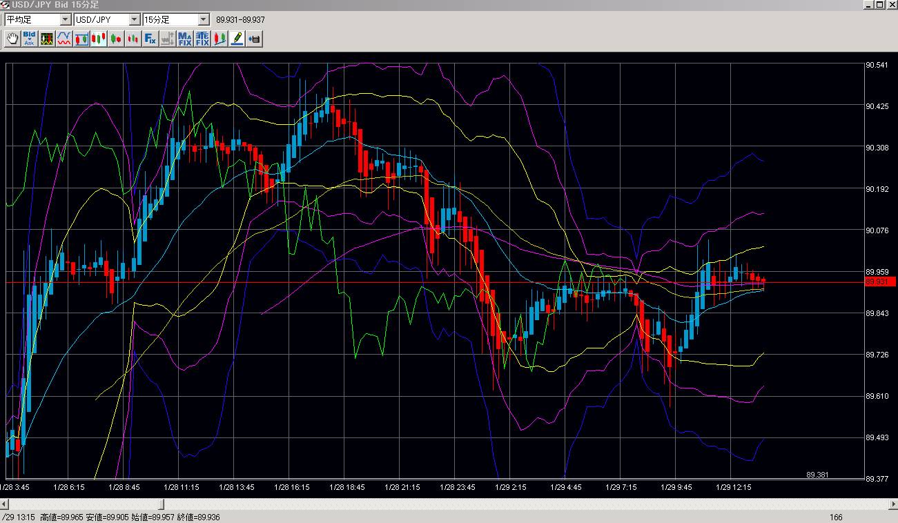 昨日、朝方の動きをみて、上かな~と見ましたが、一応90.5円のラインを超えたら明確に上昇、反面90円を割ってきたら下降継続と判断してました。